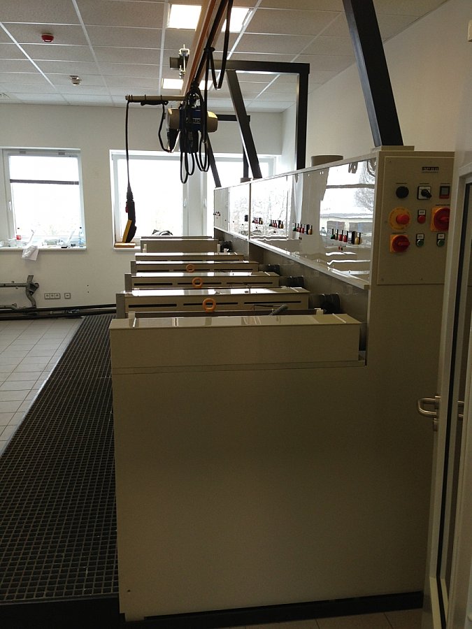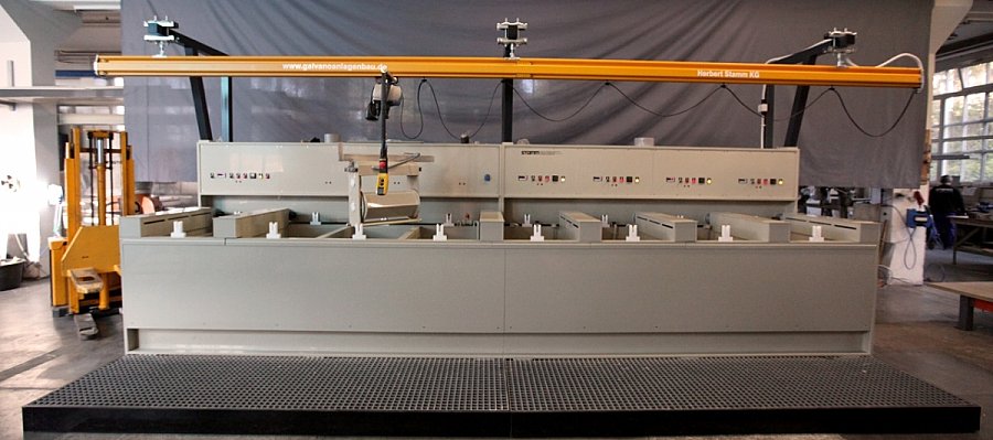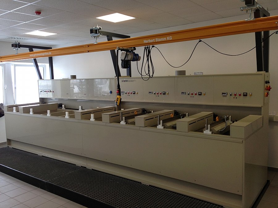 Modulare Handgalvanik mit 8 Wannenteilen aus PP zum phosphatieren. Auch hier haben wir einen modularen Aufbau mit Hauptteil (Elektronik, Bedien-Tafel, Absaugung und Handkran) sowie einen Wannenteil mit Spülen und Aktivbädern sowie der dazu gehörigen Technik.